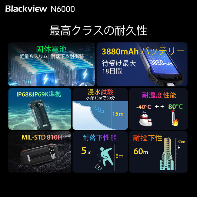 厳しい環境に立ち向かうために作られたN6000は、クラシックなBlackviewのデザインと、固体電池(ソリッドステートバッテリー)などの選ばれた材料を採用することで、より高い耐久性を実現しています。
