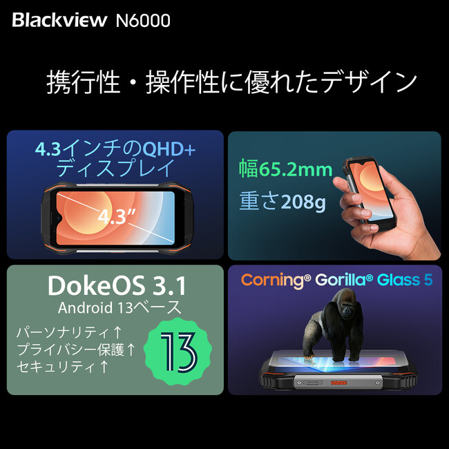 Blackview初のミニタフネススマホであり、4.3インチディスプレイを搭載した小型の筐体は、MIL-STD-810H規格の耐久性およびIP68・IP69K等級の防水・防塵規格に対応。これまでで最も頑丈なスマホを謳っています。