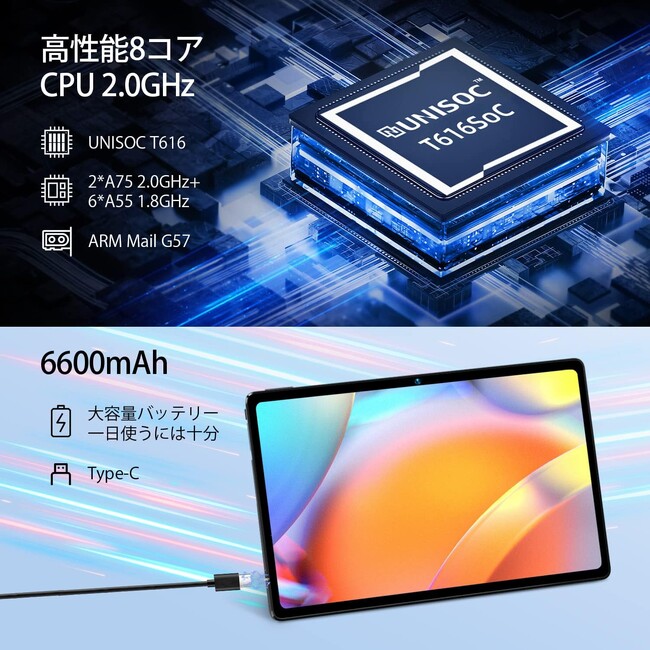 【高性能と高コスパ】UNISOC T616の強力な8コア高速処理チップを搭載し、A75アーキテクチャコアを使用、最大周波数は2.0 Ghz対応、AnTuTu実行ポイントは255,000を超えます。ARM Mail G57グラフィックプロセッサを使用しているので、人気のモバイルゲームをすごく滑らかに遊ぶことができます。