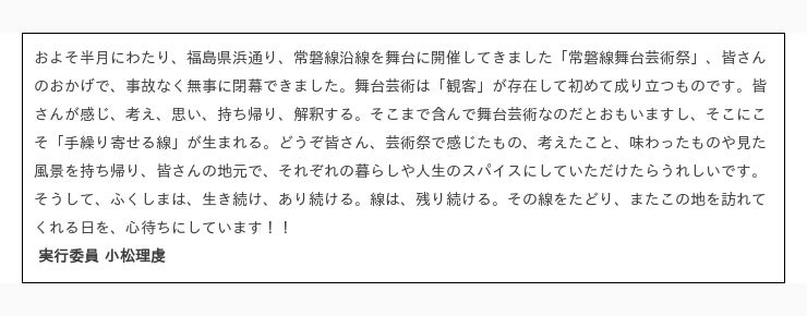 常磐線舞台芸術祭は、東日本大震災と原発事故によって大きな傷を負い、いまだにその痛みが残る地域で、地域本来の美しさや魅力を再発見し体感してもらうことを目的とした芸術祭として企画、開催されました。