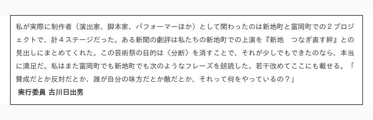 ●実行委員:小松理虔、相馬行胤、平田オリザ、古川日出男、柳 美里、和合亮一、いわき芸術文化交流館アリオス