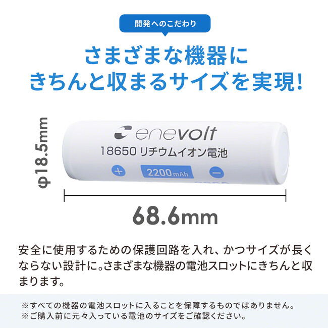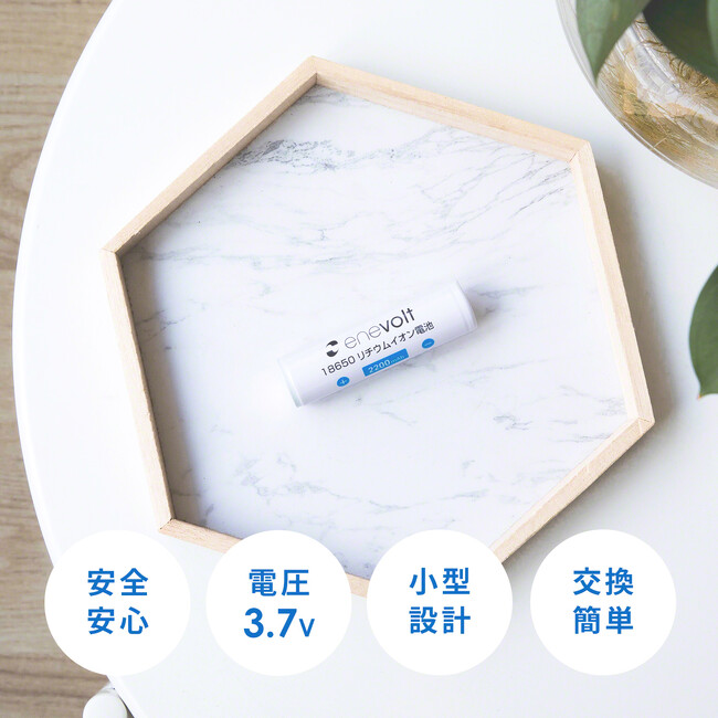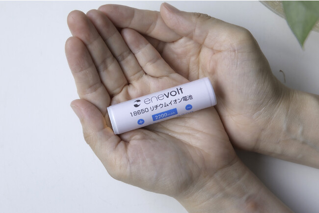 enevoltブランドの新製品である18650リチウムイオン蓄電池は、カメラ、小型扇風機、懐中電灯、電動歯ブラシ、ヘッドライト、電動シェーバーなど、充電式機器に使える交換用バッテリーです。各種デバイスに適した高い汎用性を持ち、同等仕様の既存電池の交換用として使用できます。PSE(電気用品安全法)の適合性検査をクリアし、電圧3.7V、容量2200mAhの高性能を誇ります。