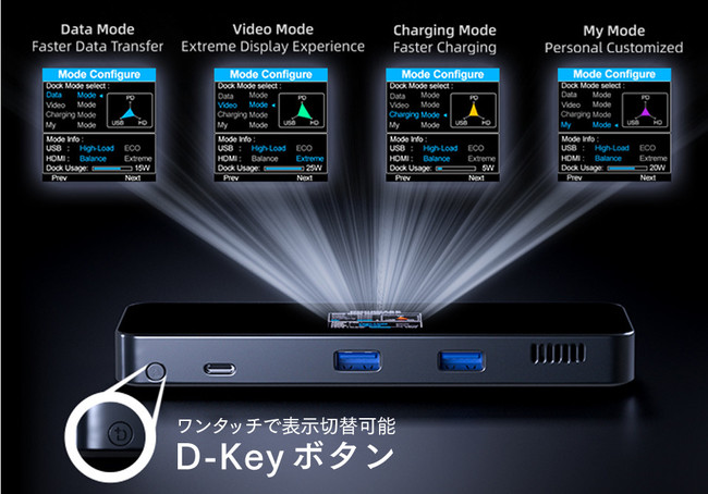 【VisualDock2】はさまざまなモードへ設定を切り替えることが可能ですが、それに伴う複雑な操作などは必要ありません。本体に付いているD-Keyボタンをワンタッチするだけで、画面表示を簡単に切り替えることができます。また、両側面にポートを装備しているため、PCのUSB-Cポートの配置箇所に合わせて画面の向きを変えることも可能です。