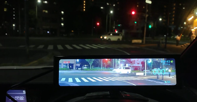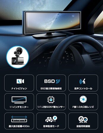 SONY製超強暗視センサー採用のフロントカメラにより、肉眼では見えない暗闇でも前方を撮影でき、ヘッドライトだけでは目視しにくい夜間運転時の視界補助のほか、夜間の降雨・降雪時などもフルカラーでクリアな前方映像を11インチのワイドなディスプレイに表示してくれる。