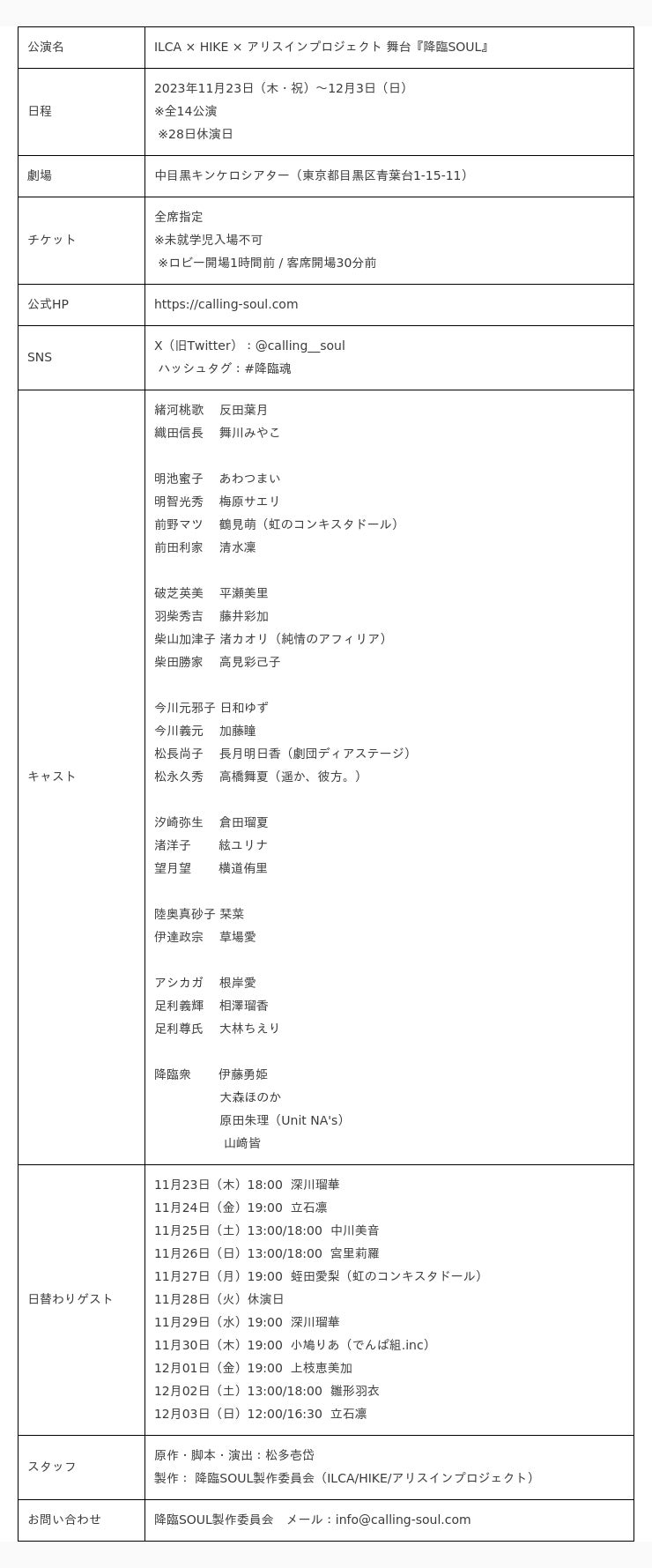 「ILCA × HIKE × アリスインプロジェクト」は、製作する舞台『降臨SOUL』(原作・脚本・演出:松多壱岱)の全キャストが決定したことをお知らせいたします。主演・緒河桃歌役を反田葉月、武将・織田信長役を舞川みやこが演じます。また、全公演に日替わりゲストも出演。チケットは本日8月25日18時よりFC先行+キャスト先行の受付を開始します。「戦国降臨シリーズ」の初演から11年を経てリブートされる『降臨SOUL』にご期待ください。
