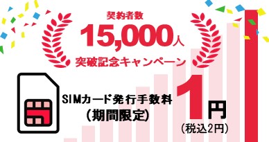 2023年8月21日より、【SIM1円】契約者数15,000人突破キャンペーンを開始し、期間限定でSIMカードの発行手数料が1円(税込2円)となります。
