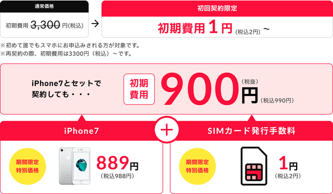 『誰でもスマホ』では、同日8/21のiPhone7の大幅値下げに伴い、iPhone7+SIMのセット契約が900円(税込990円)でご案内可能となりました。