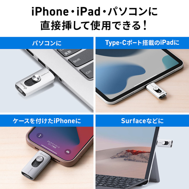 Lightningコネクタがメモリ本体から4mm浮き上がっており、ケース付けたiPhone・iPadでも接続しやすくなっています。iOS専用アプリ「iStick Pro 3.0」を使用してiPhone・iPadでのデータ共有、また、USB3.2 Gen1対応 Type-Cコネクタを使用して、Type-Cコネクタ搭載のパソコン、iPadなどとのデータ転送が可能です。iPhone・iPadの写真アプリ内の画像・動画を本製品にコピー、また、連絡先のバックアップを行えます。本製品に保存した画像や動画をiPhone・iPadのカメラロールへコピーすることができます。本製品に保存した音楽データをiOS専用アプリ「iStick Pro 3.0」アプリにコピーすることができます。本製品に保存したWord、Excelファイル形式などのドキュメントデータを閲覧、その他、iOS専用アプリ「iStick Pro 3.0」にコピーすることができます。JPGやGIF、MP3やM4V、WordやExcelなど幅広い形式のファイルの閲覧に対応しています。