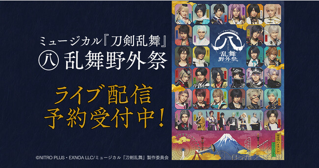 合同会社DMM.com(本社:東京都港区、会長 兼 CEO:亀山敬司 以下「DMM」)は、ミュージカル『刀剣乱舞』 ㊇ 乱舞野外祭(すえひろがりらんぶやがいまつり)の全公演を「DMM TV」にてライブ配信いたします。本日9月5日(火)よりDMM TV特設サイトにてライブ配信の予約販売を開始いたしました。 また、ミュージカル『刀剣乱舞』シリーズより大型公演の過去作品を9月11日(月)〜9月16日(土)までの6夜連続で無料配信いたします。是非お見逃しなく!