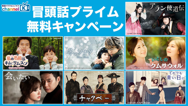 さらに、チャンネルKで全話配信中の人気作の中から期間限定で、冒頭話見放題キャンペーンも実施中。アジアで社会現象を巻き起こしたペ・ヨンジュン、チェ・ジウ主演の不朽の名作「冬のソナタ」をはじめ、ヒョンビン主演の胸キュンラブストーリー「私の名前はキム・サムスン」、イ・ジュンギ、シン・ミナ共演のファンタジー時代劇「アラン使道伝」など計7作品の冒頭話をAmazonプライム会員なら無料でご視聴いただけます。この機会にぜひチャンネルKで韓国ドラマをお楽しみください。