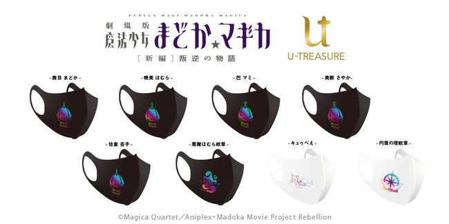 大人のための本格的なキャラクタージュエリーを扱うユートレジャー(東京都豊島区:代表取締役:伊藤 崇史)は、「劇場版 魔法少女まどか☆マギカ[新編]叛逆の物語」とコラボし、オーロラリフレクションマスク8種類を1月14日(金)〜2月14日(月)の期間限定で予約受付を行ないます。このたびの新作は、世界特許技術「LIGHT FORCE(R)️」を採用したポリエステル製のマスクです。スマートフォン等の「フラッシュ機能オン」で撮影すると、普段は目立たないデザインが、オーロラ色に反射して映ります。ブラックベースのマスクは、鹿目まどか、暁美ほむら、巴マミ、美樹さやか、佐倉杏子、それぞれのソウルジェムに、悪魔ほむら紋章を加えた6種類のデザイン、ホワイトベースのマスクは、キュゥべえ、円環の理紋章の2種類のデザイン展開です。ユートレジャーコンセプトストア池袋、ユートレジャーオンラインショップにて取り扱います。