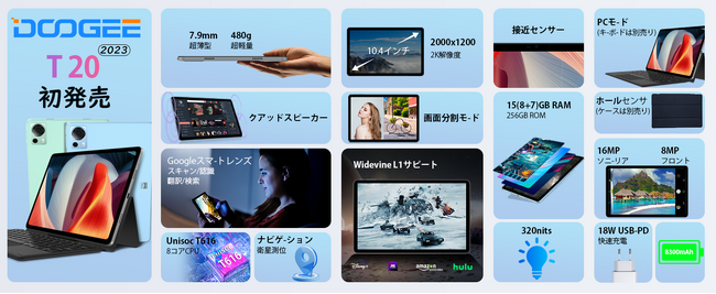 DOOGEE T20 Tabletは、10.4インチの2Kフルラミネーションディスプレイを搭載し、2000 x 1200ピクセルのUltra HD解像度とT-Colour 2.0カラー最適化技術により、優れたオーディオビジュアル性能とスムーズな視聴体験を提供します。. 視覚保護のための複数の画面表示モード。読書、ビデオ鑑賞、チャットを快適に行い、目の疲れを軽減します。