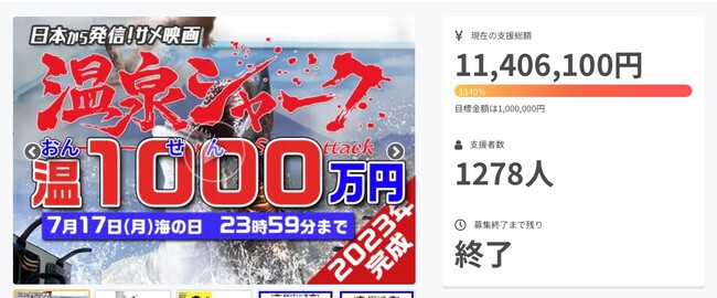 映画『温泉シャーク』クラウドファンディング(サイト:CAMPFIRE)開始わずか5時間で目標額100万円に達成!7月3日にネクストチャレンジ489(しゃあく)万円突破、最終的には7月17日にファイナルゴール温1000(せん)万円の目標を大きくクリアして1104万6100円の支援額になり、支援者の数は1278人となりました。