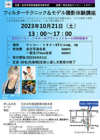 株式会社ケンコー・トキナー(本社:東京都中野区 代表取締役社長 山中 徹)は、写真愛好家向けセミナーにセミナールームを提供。10月21日(土)に、全日本写真連盟東京支部の主催で「フィルターテクニック&モデル撮影体験会」を行います。フィルターテクニックの講師は、ケンコー・トキナーチーフデモンストレーターの田原栄一です。 参加費は全日写連会員が3,000円(税込)、一般およびWEB会員が4,000円(税込)で、定員は50名です。 皆様のご参加をお待ちしております。