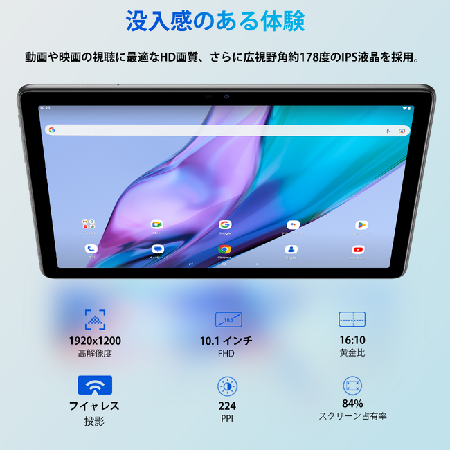 10インチ / Android 13 / 11GB(6+5GB拡張)RAM+128GB ROM+1TB拡張 / WideVine L1対応 / 1920*1200 FHD IPS /8+5MP カメラ / 画面分割