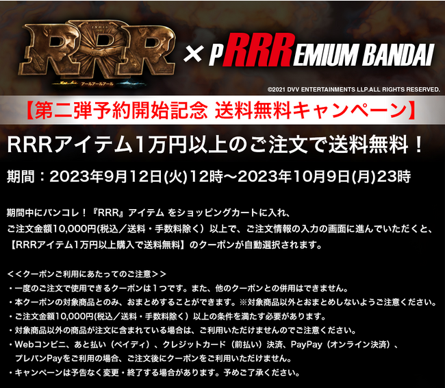 RRR×P“RRR”EMIUM BANDAI(プレミアムバンダイ)第二弾を記念して、「RRR×P“RRR”EMIUM BANDAI(プレミアムバンダイ)送料無料キャンペーン」を実施いたします。