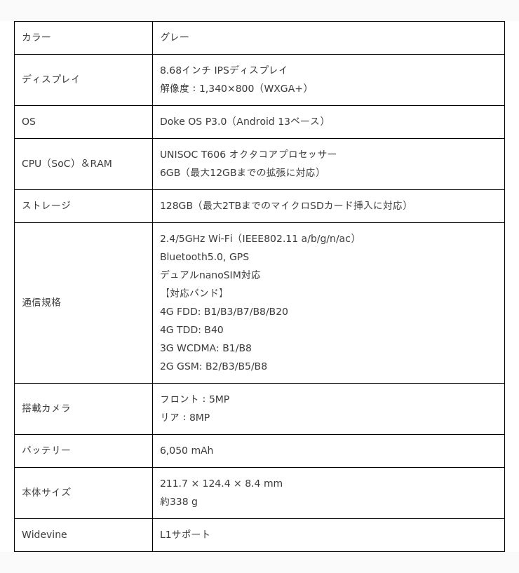 8.68インチディスプレイを搭載したコンパクトサイズのタブレットであり、軽くて持ちやすく、持ち運びにも適したモデルとなっています。GMS認証を取得済み。
