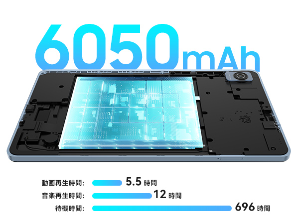 6,050mAhの大容量バッテリーを搭載。最新のバッテリー最適化機能を備えており、動画の連続再生時間は約5.5時間、待機時間は約696時間に達します。通勤時に電子書籍リーダーとして使用したり、日常的なメディア視聴用端末としての用途などにも完全に対応できます。