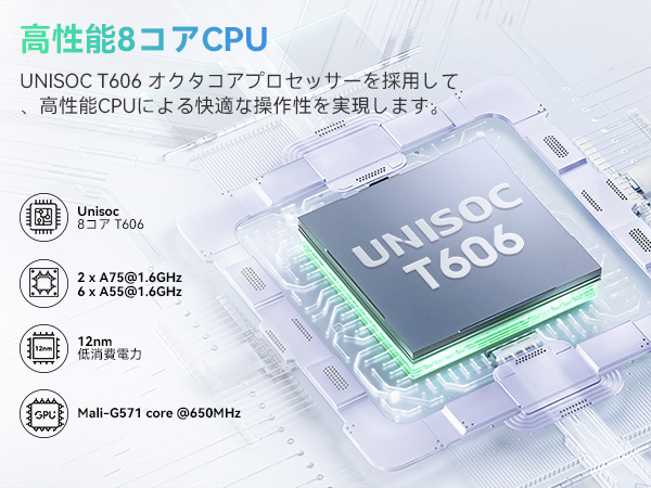 CPU(SoC)にはUNISOC T606 オクタコアプロセッサーを、RAMは6GBを採用。一般的なタブレット用途は問題なくスムーズにこなせるだけの性能を擁しています。RAMは最大12GBまでの拡張(仮想RAM)が可能で、よりスムーズなタブレット操作を楽しめるようになります。