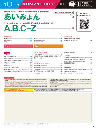 『月刊ローチケ』の表紙には、大晦日にNHK紅白歌合戦へ3度目の出場を果たし、4月から全国アリーナツアーを開催する「あいみょん」。そして『月刊HMV&BOOKS』の表紙には、デビュー10周年を迎え2月1日(火)にキャリア初のベストアルバム『BEST OF A.B.C-Z』をリリースする「A.B.C-Z」が登場!