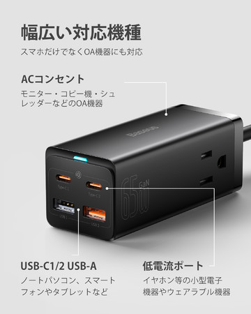 AC用とDC用でそれぞれ独立したBaseus独自の冷却システムにより、複数台同時充電という過酷な使用パターンでも本体が熱くなりにくい仕様を実現。さらにUSB出力は次世代のパワー半導体素材を採用することで充電効率を向上させる最先端のGaN充電テクノロジーも採用することで、最大65Wの高出力/急速充電を可能にしながらも高い安全性を確保したままで本体はわずか約97*41*38mmという手のひら大に収まるクラス最小級のコンパクトさを実現しました。