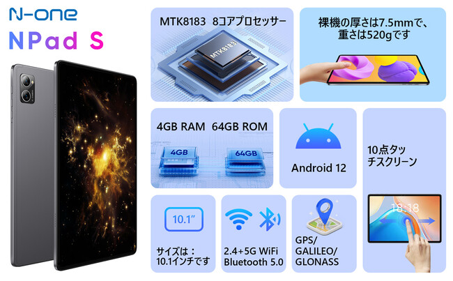N-one Npad S Android 12 タブレット 10.1インチ wi-fiモデル、 タブレット 8コア CPU 2.0Ghz、4GB+64GB+1TB TF拡張可能、1280*800解像度HD IPSディスプレイ、 GMS認証+2.4G/5G WiFi+6600mAh、Bluetooth 5.0+GPS+2MP/5MPカメラ 子供にも適当贈り物/子供用タブレットPC、オンライン授業 [SIM対応しない]日本語取扱説明書付き