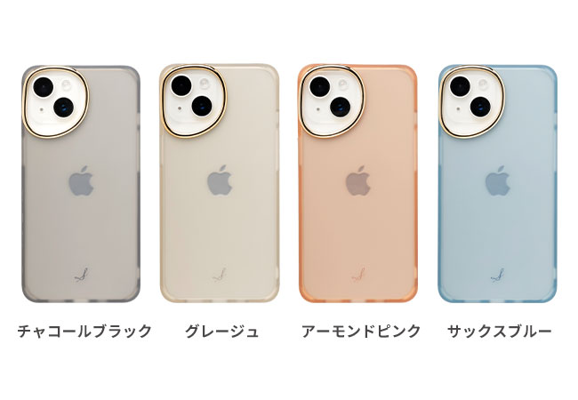 マットでクリアな背面に、カメラホールのゴールドパーツ。2つの異なる質感は、普段使いにもオフィスにも、シンプルに映えてアクセントになるデザインです。存在感のあるカメラホールをあえて縁取りすることで、美しく印象的なデザインに仕上げました。背面はさらさらした質感のため、指紋が付きにくく目立ちにくいのも嬉しいポイントです。カラーはチャコールブラック、グレージュ、アーモンドピンク、サックスブルーの4色。品のある透明感はスマホを持つ手元を美しく見せてくれます。写真やステッカーなどを挟むと、すりガラスのようなスモークのかかった風合いでアレンジを楽しむこともできます。