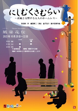 劇団まっとーば〜主催、『にしむくさむらい 〜夜風と交響する五人のホームレス〜』が2023年10月20日 (金) 〜2023年10月22日 (日)にシアター風姿花伝(東京都新宿区中落合2-1-10)にて上演されます。 チケットはカンフェティ(運営:ロングランプランニング株式会社、東京都新宿区、代表取締役:榑松 大剛)にて発売中です。