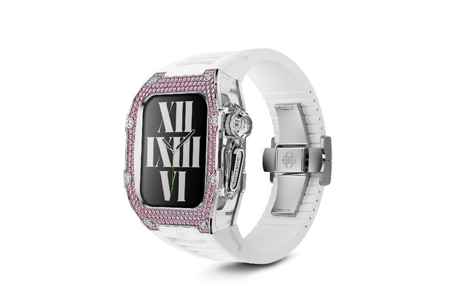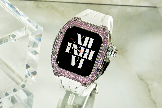 高級感たっぷりなホワイトのラバーストラップとピンク色の輝きがお互いを引き立て合い、印象に残る手元を演出します。