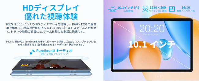 P30Sは、新世代のPureSound Audio スピーカーを採用し、独立したアンプチップに合わせて使用すると、臨場感あふれるオーディオ体験ができます。3.5mmヘッドフォンジャックを備え、様々なユーザーの好みに対応できます。また、保護者が懸念するタブレットの使用時間や使用アプリの選択などの問題点に対応し、新たな児童守護機能を開発しました。学びと遊びをバランスよく楽しめるタブレットになります。
