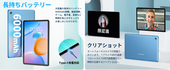 アップグレードされた6GBメモリーと128GBのストレージで、好きな音楽、映画やより余裕に保存することができます。更に、TFカードの容量拡張に対応し、ほとんどの主流アプリの高速処理に満足できます。最大2.0GHzの周波数を持つ4つの高性能A73コア、およびMali-G72MP3マルチコアGPUを備えたMediaTek MT8183 8コアプロセッサを搭載して設計されています。 動画の視聴、音楽鑑賞など、スムーズでシームレスな体験を提供します。