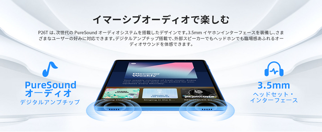 「P26T」は、次世代のPureSoundオーディオシステムを搭載したデザインです。3.5mmイヤホンインターフェースを装備し、さまざまなユーザーの好みに対応できます。デジタルアンプチップ搭載で、外部スピーカーでもヘッドホンでも臨場感あふれるオーディオサウンドを体感できます。Type-Cインターフェースは、どちら向きでも挿入可能で、充電がより便利になります。