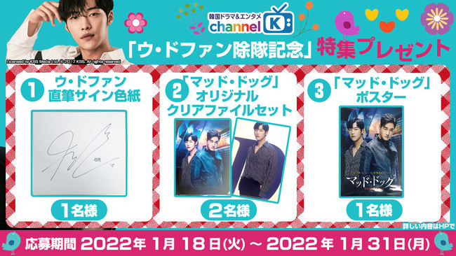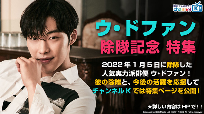 そんな彼の除隊を記念し、公式サイトでは「チャンネルK」で視聴可能なウ・ドファン出演作の紹介に加え、過去の貴重なインタビューの公開や直筆サイン色紙などが当たるプレゼントキャンペーンを実施中。