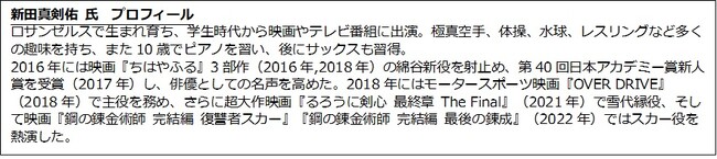 新田真剣佑氏は国内外問わず活躍する大人気俳優で、映画『るろうに剣心 最終章 The Final』(2021年)や映画『鋼の錬金術師』シリーズ(2022年)など大ヒット作に出演。さらに映画『ちはやふる』3部作(2016年,2018年)では第40回日本アカデミー賞新人賞も受賞。
