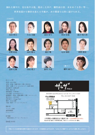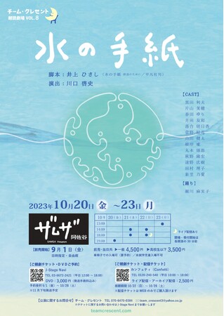 チーム・クレセント主催、朗読劇場VOL.8『水の手紙』が2023年10月20日 (金) 〜2023年10月23日 (月)にザムザ阿佐谷(東京都杉並区阿佐ヶ谷北2-12-21)にて上演されます。 チケットはカンフェティ(運営:ロングランプランニング株式会社、東京都新宿区、代表取締役:榑松 大剛)にて発売中です。