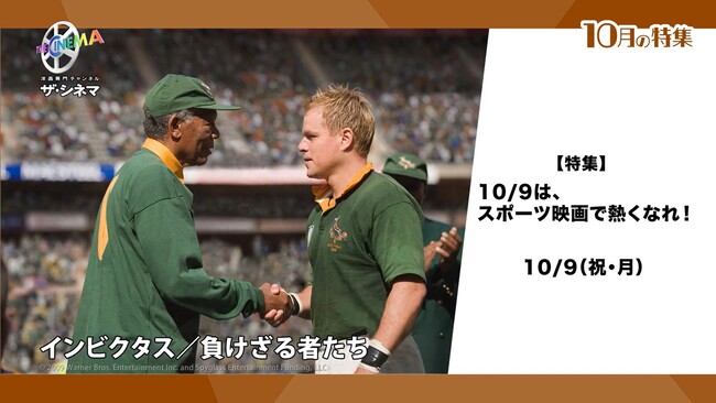 洋画専門チャンネルザ・シネマ(AXN株式会社、本社:東京都渋谷区、代表取締役社長 大園天樹)では、10月9日の「スポーツの日」に合わせ、様々なスポーツ映画を特集放送いたします。10月9日(祝・月)に7作品をお届けいたします。