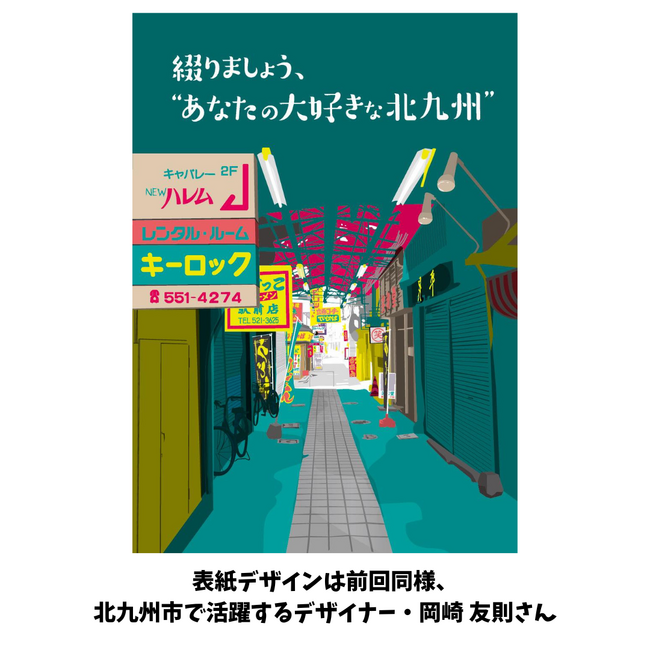 前回に続き、表紙のデザインを北九州市で活躍するグラフィックデザイナー・岡崎友則さんにお願いしました。かつての小倉駅南口の飲食店街の様子をデザインしています。本エッセイ集のための描き下ろしです。