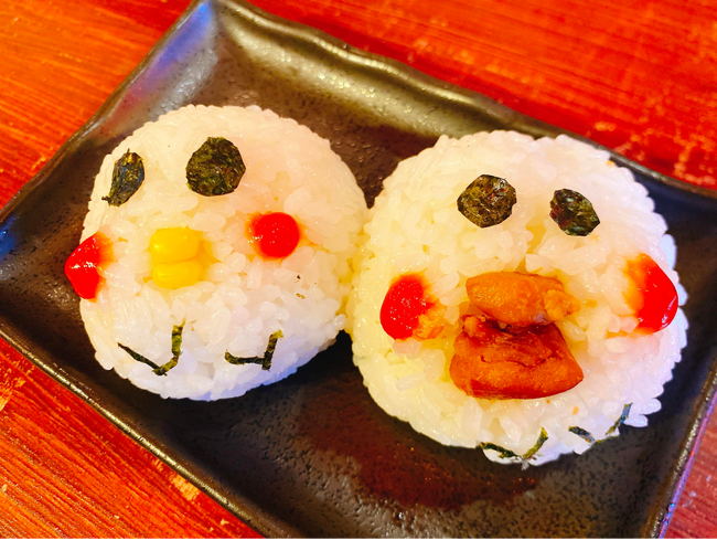 ひよこをイメージしたかわいいおにぎり(1皿2個)。くちばしはコーン(左)と佃煮(右)です。おにぎりの中には、片山鳥肉店特製の唐揚げが入っており、お子様でもおいしく召し上がれます。
