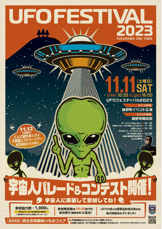 UFOの里で知られる福島県福島市飯野町で11月11日、第2回目となる伝説のUFOフェスティバル2023が開催される。UFOの里いいの聖地化プロジェクト(福島県福島市飯野町)の主催。フェスティバルのメインとなる宇宙人(仮装)パレード&コンテストには、国内をはじめ海外から約2,000人の参加者が集まり、街なかが宇宙人で埋め尽くされる日となる。UFOと宇宙人に特化したイベントとしては国内最大。