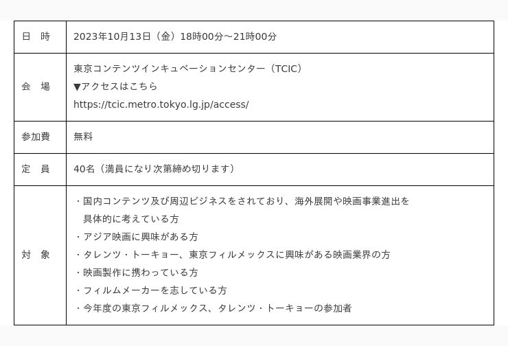株式会社ツクリエ(本社:東京都千代田区 代表取締役:鈴木英樹 以下、ツクリエ)が東京都より運営受託をする、東京コンテンツインキュベーションセンター(以下、TCIC)は、「第24回東京フィルメックス プレイベント 〜国際共同製作プロデューサーズセッション〜」を10月13日(金)に開催します。国際共同製作プロデューサーの育成にフォーカスした、東京フィルメックスのプレイベントです。皆様のご参加お待ちしております。