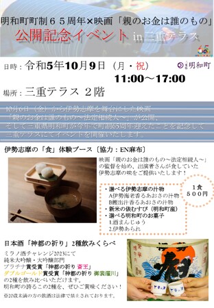 【10月9日開催】三重県明和町町制65周年&映画「親のお金は誰のもの」公開記念イベントin東京日本橋三重テラス