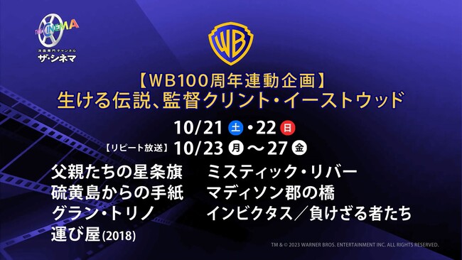 洋画専門チャンネルザ・シネマ(AXN株式会社、本社:東京都渋谷区、代表取締役社長 大園天樹)では、「WB100周年連動企画」の第3弾として、90歳を超えてまだまだ大活躍中のクリント・イーストウッドの監督作品から名作をセレクトし、 10月21日(土)、22日(日)(リピート放送:10月23日(月)〜27日(金))に7作品をお届けいたします。合わせてプロジェクターなど豪華賞品が抽選で当たるプレゼントキャンペーンも開催いたします。