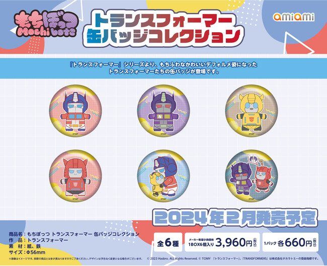 フィギュア&ホビー通販大手の「あみあみ」を運営する、大網株式会社(本社・東京都文京区)は、変形ロボットキャラクター『トランスフォーマー』(発売元:タカラトミー)より、もちふわなかわいいデフォルメ姿になった「もちぼっつ トランスフォーマー」の「アクリルスタンド」「缶バッジコレクション」「クリアファイルセット」を、2024年2月予定で発売いたします。