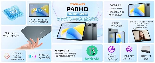 10インチ / Android 13 / 16GB(8+8拡張)RAM+128GB ROM+1TB TF拡張 / FHD IPSインセルディスプレイ / 4G LTE+WiFiモデル / Widevine L1対応 / GPS機能サポート / 3.5mmヘッドホン端子