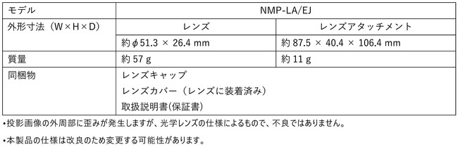 NMP-LA1はNMP-NX1の投影画像を約1.5倍に拡大するワイドアングルレンズです。