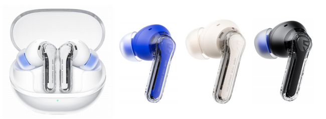 本体および充電ケースには、人気のトランスルーセントデザインを採用。内部基板や電子部品がわずかに透けて見えるデザインは、感度の高いデジタルガジェットファンを意識しています。カラーバリエーションはホワイトとブルー、ベージュ、ブラックの全4色。お好みの色を自由にお選びいただけます。