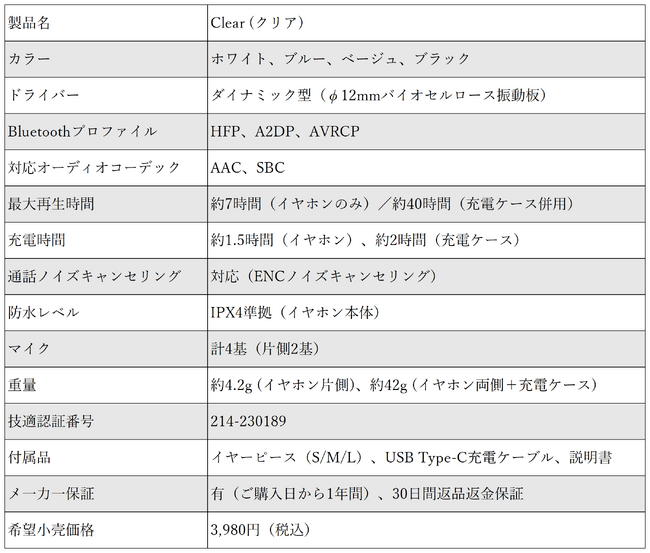 トランスルーセントデザインを採用、最大40時間再生で音声通話ノイズキャンセリング搭載の完全ワイヤレスイヤホン「Clear」