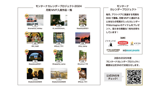 株式会社ハック(本社:大阪府東大阪市、代表取締役:有山哲也)が運営する、アウトドアブランド「Montagna(モンターナ)」は、アウトドアの魅力を広く発信する取り組みとして、SNS参加型のフォトコンテスト「#モンターナカレンダープロジェクト2024」を実施しました。 旅先での風景や、キャンプ飯などアウトドアならではの素敵な写真を2022年12月から2023年9月に募集。 毎月のMVPに選ばれると豪華景品と2024年カレンダーへの写真を掲載&プレゼントします。 今回は、年間300件以上の応募から選ばれた全10枚の写真から、更にグランプリとして10枚の中から協賛社賞が選ばれます。豪華景品は誰の手に!?各月を代表する月間MVPと協賛社賞(グランプリ)の結果を発表します。