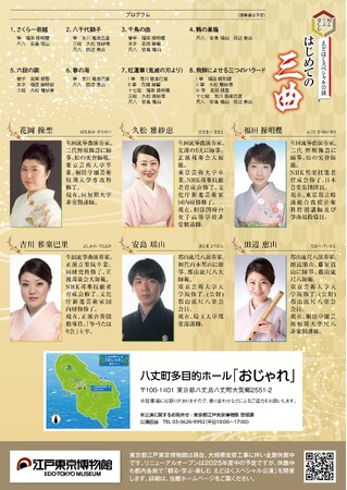 小学生・中学生、また日常邦楽に触れる機会の少ない方々に向けて、箏、三味線、尺八の音色と、日本の音楽の魅力をお伝えします。それぞれの楽器の特徴や演奏の技を解説するとともに、お正月番組や教科書でもおなじみの「春の海」など親しみやすい古典や名曲を中心に演奏します。