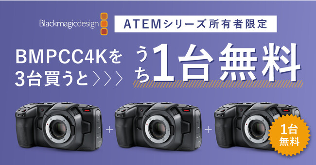 Blackmagic ATEMシリーズをお持ちの方を対象に、『Blackmagic Pocket Cinema Camera 4K』3台を2台分の価格でご購入いただける数量限定のキャンペーンです。